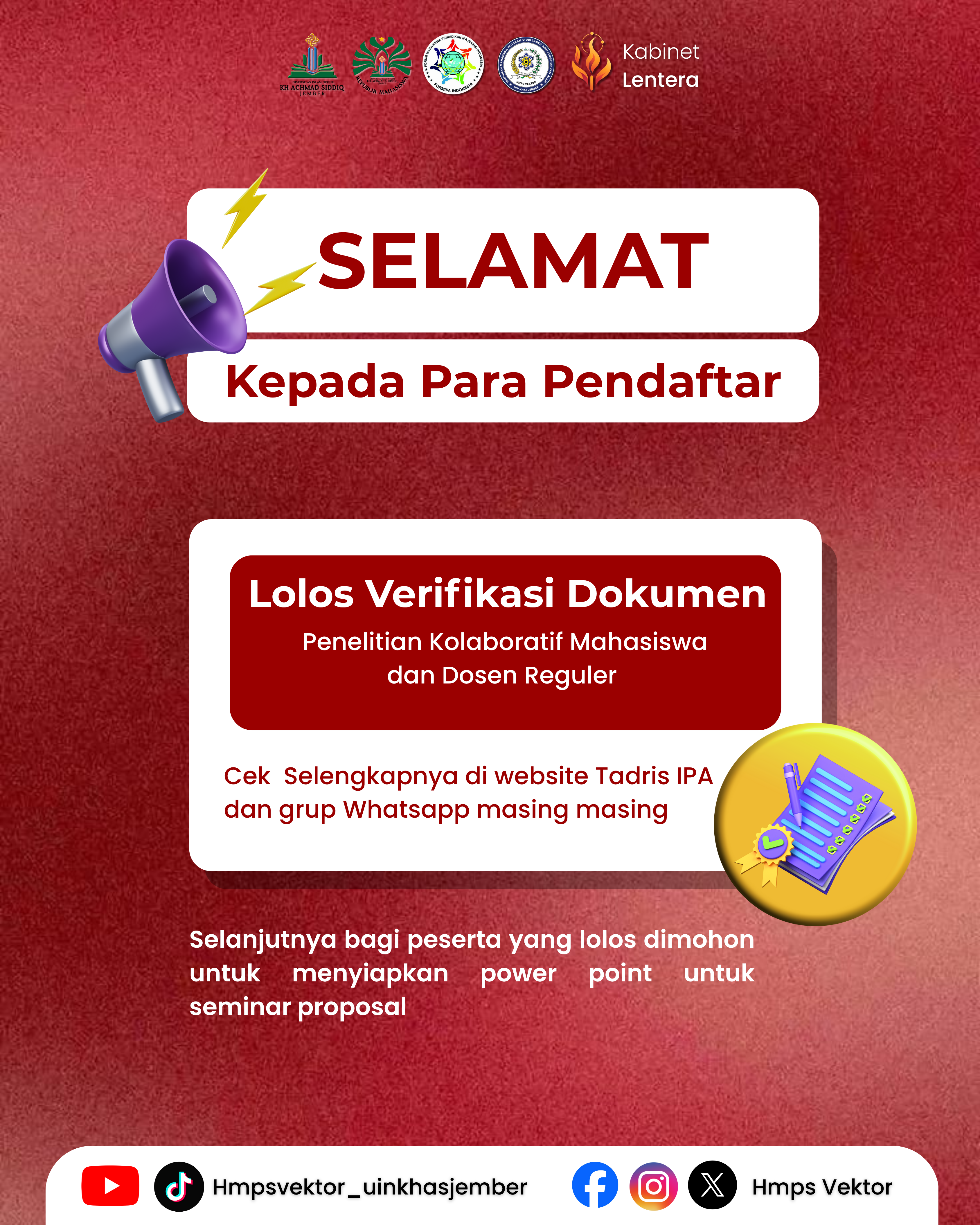 Program Studi Tadris IPA FTIK UIN Kiai Haji Achmad Siddiq Jember resmi mengumumkan pelaksanaan Lomba Video Reels Instagram yang digelar dalam rangka mendukung kreativitas mahasiswa pada kegiatan mata k...
